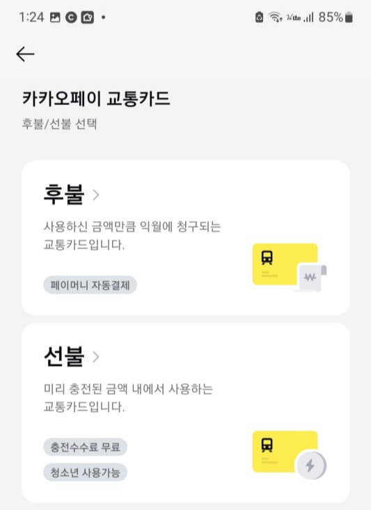 ◆ 사용한 만큼 다음 달 청구되는 후불교통카드와 충전을 하여 사용하는 선불교통카드 중 선택하세요.