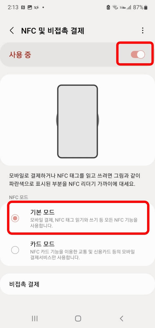 ◆ 기본모드를 선택하고 NFC활성화를 시켜주면 됩니다.