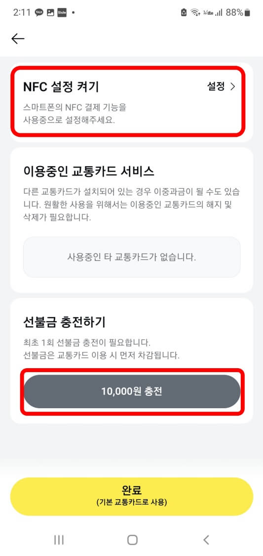 ◆ 선불 1만원을 충전하고 NFC설정 켜기로 들어가세요.