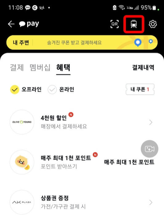 ◆ pay - 결제 - 상단의 지하철 모양을 눌러주세요.