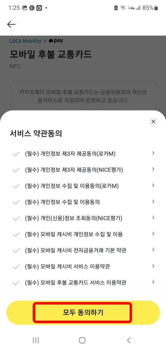 ◆ 서비스 약관동의에서 모두 동의하기를 누르세요. 선불교통카드는 약관 동의하면 바로 발급됩니다.