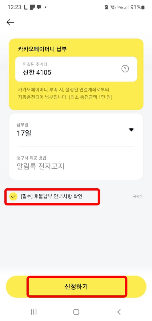 ◆ [필수] 후불납부 안내사항 확인 체크하고 신청하기 누르세요.