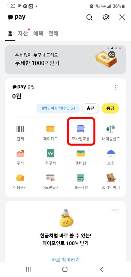 ◆ pay - 모바일교통을 눌러도 됩니다.
