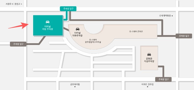 터미널 주차장 주소는 광주광역시 서구 무진대로 904 유스퀘어 입니다. 진입 경로는 다음과 같습니다.