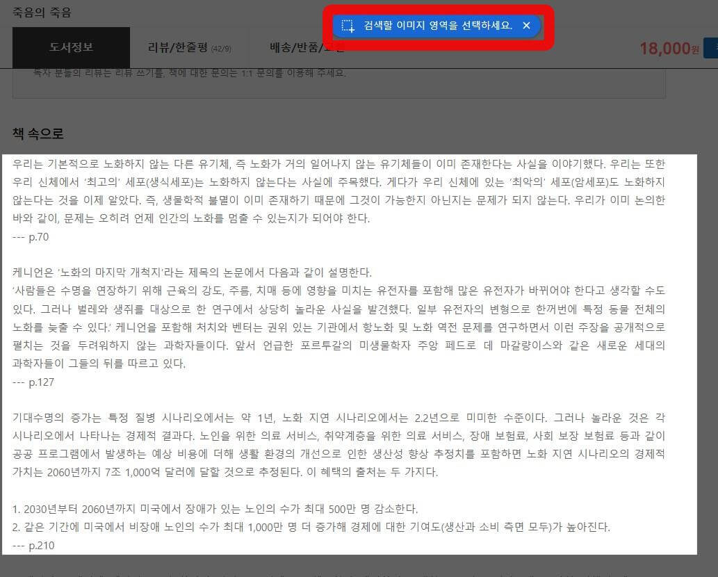 검색할 이미지 영역을 선택하세요 를 누른 후 텍스트 부분을 드래그하세요.