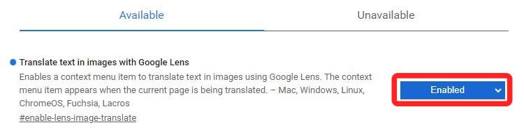 3. "Translate text in images with Google Lens" 항목을 찾아 'Default'(기본값 모드)에서 'Enabled'(활성화 모드)로 변경해 주세요.