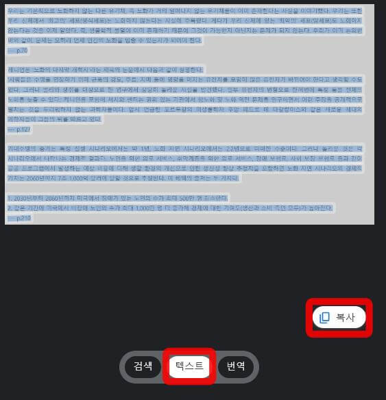 텍스트를 누른 후 필요한 텍스트를 드래그하여 선택하고 복사를 누릅니다.