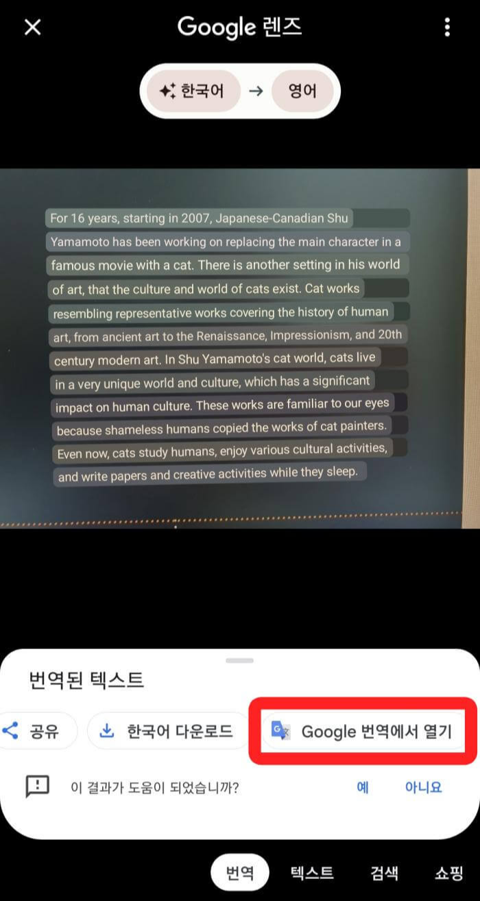 7. [구글 번역에서 열기]를 하면 원하는 언어를 선택해 번역까지 가능합니다.