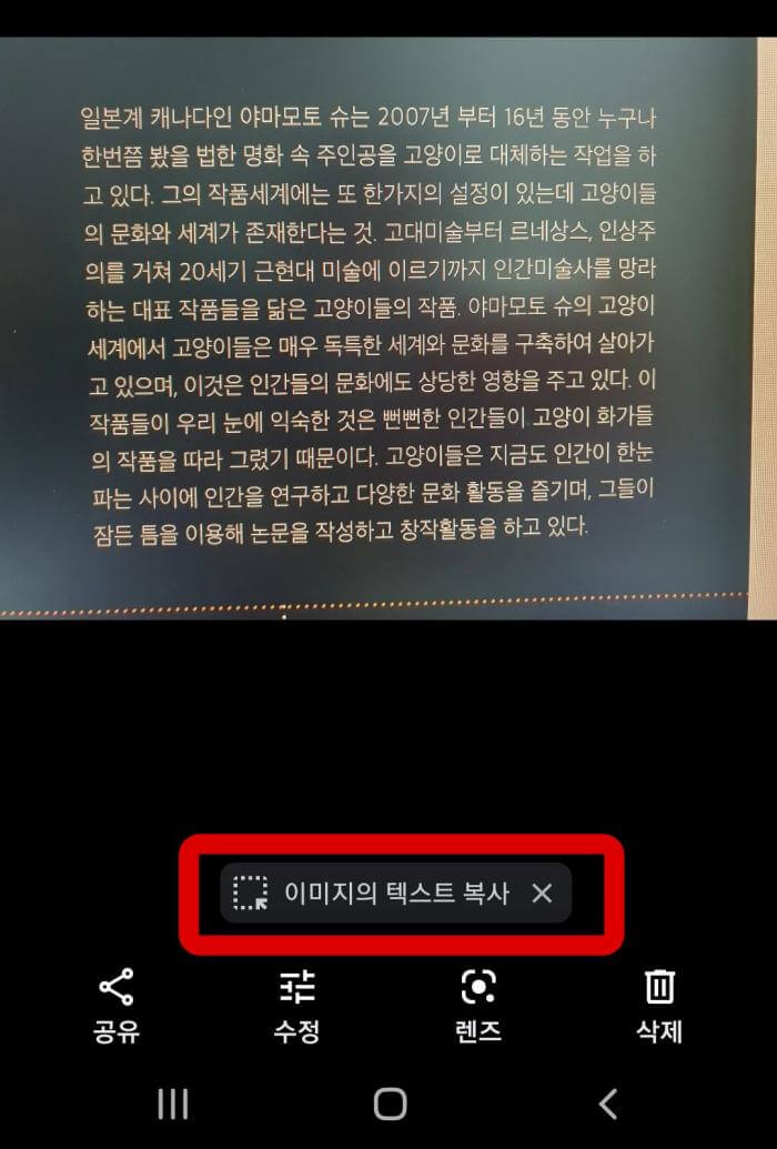 1. 텍스트를 추출하고 싶은 글을 휴대폰 카메라로 촬영합니다.