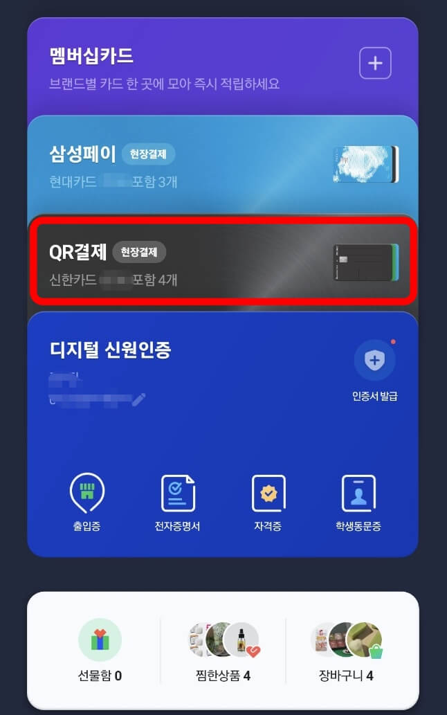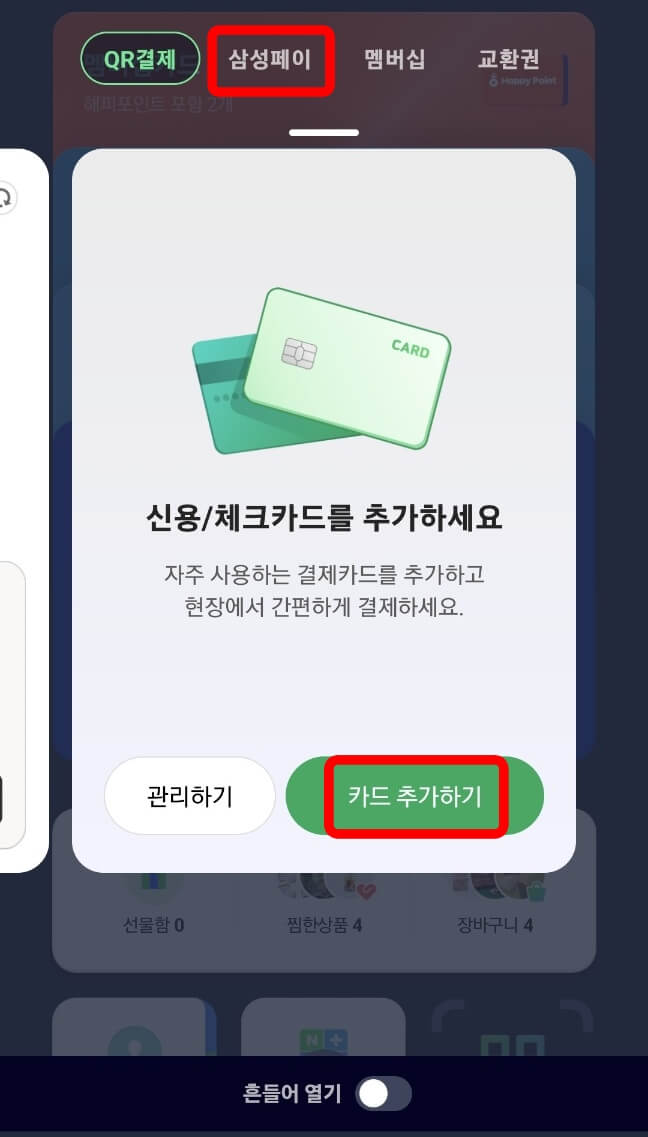 오른쪽으로 화면을 넘기면 신용/체크카드를 더 추가할 수 있습니다.