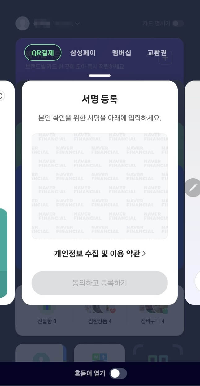 서명을 등록하면 신용카드결제, 삼성페이 결제가 가능합니다.