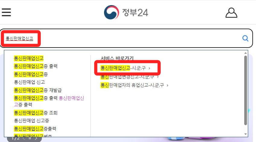 검색창에 [통신판매업신고]를 검색하여 서비스 바로가기로 들어가세요.
