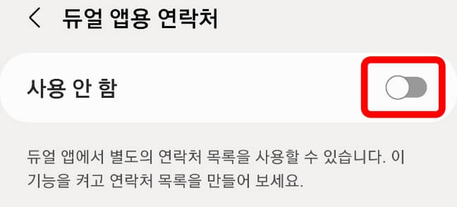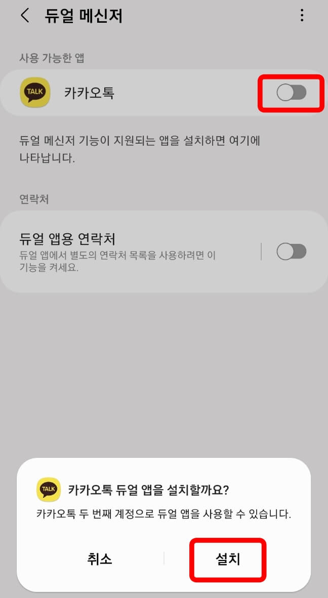 2. 사용 가능한 앱에서 카카오톡 오른쪽 버튼 활성화 - 카카오톡 듀얼앱 [설치]