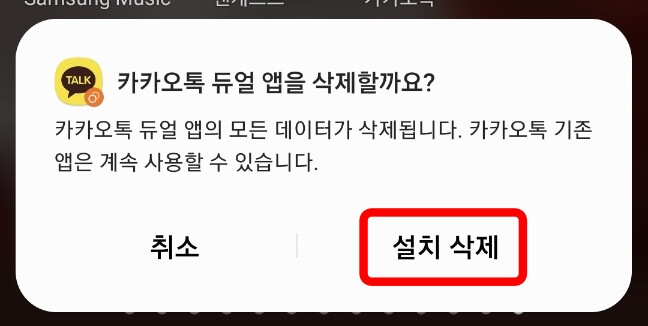 2. 카카오톡 듀얼 앱을 삭제할까요? 창이 나오면 [설치삭제] 선택