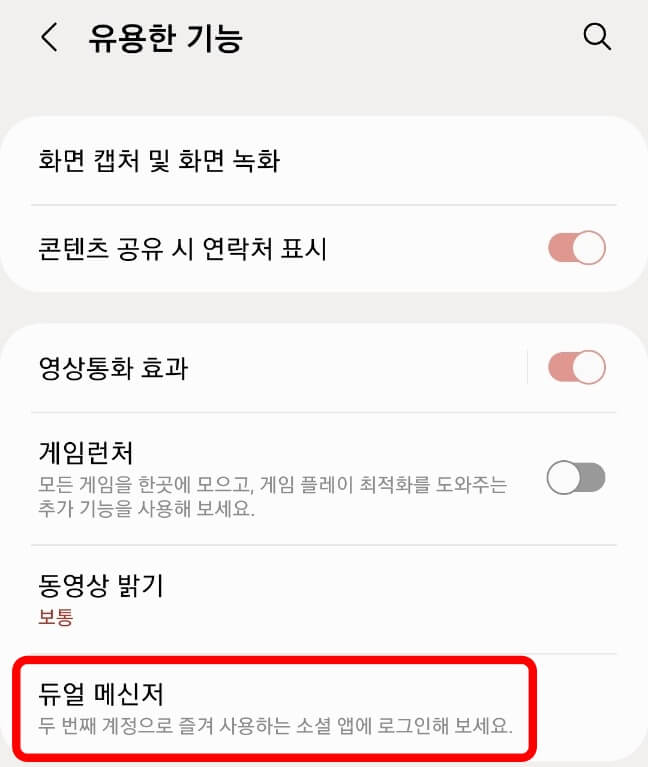 1. 스마트폰 상단에 있는 톱니바퀴 모양 [설정] - [유용한 기능] - [듀얼메신저] 선택
