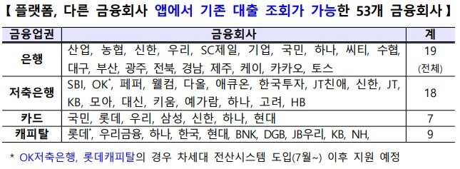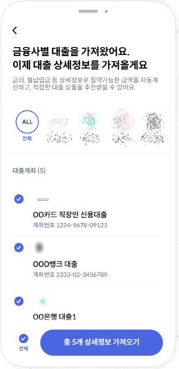 어떤 앱에서든 53개 금융회사에서 받은 기존 대출 정보를 조회할 수 있습니다.