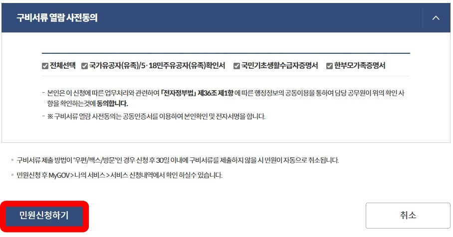 5. 구비서류 열람 사전 동의가 체크된 상태로 [민원신청하기]를 눌러주세요.
