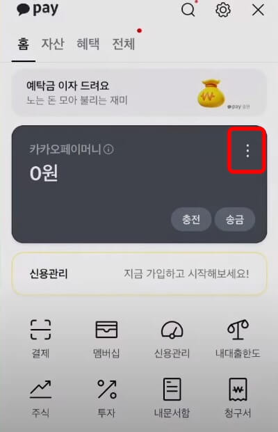 2. 카카오페이머니 우측 상단 (...) 더 보기 메뉴에서 [연결계좌] 선택