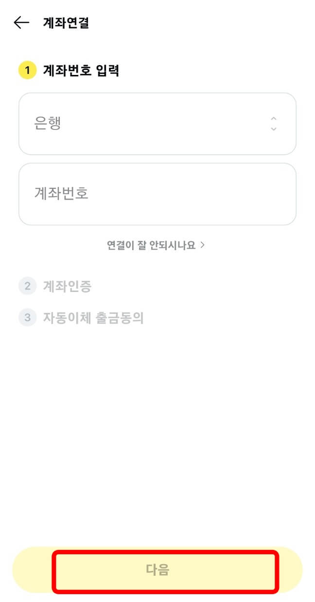 3. 은행과 본인명의 계좌번호 입력 - [다음] 선택