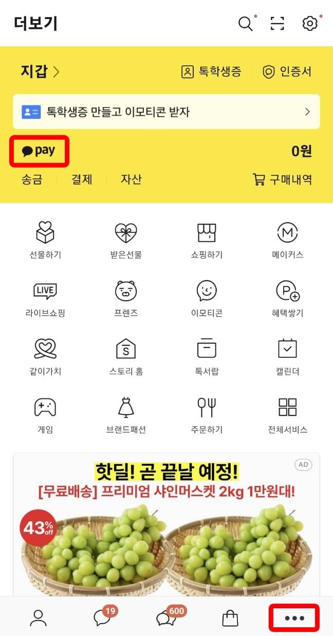 1. 카카오톡 하단(...) 더 보기 메뉴에서 [pay] 선택