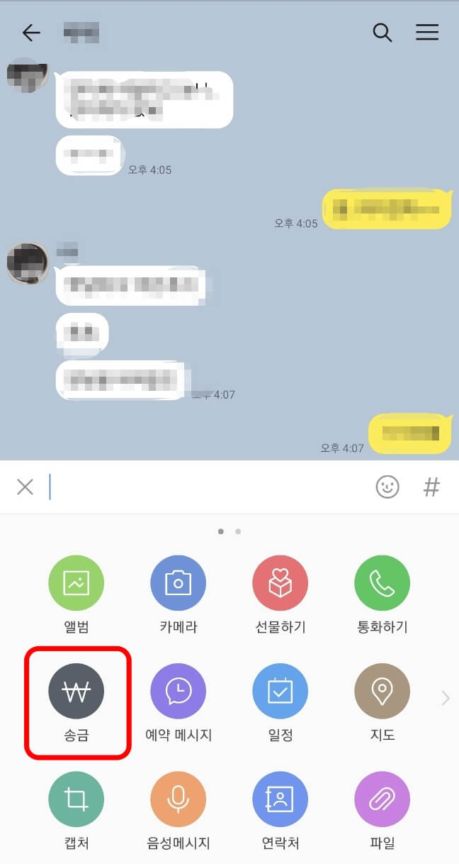 1. 카톡 친구 채팅방에서 하단의 [+] 버튼 누르고 [송금] - [송금하기] 선택