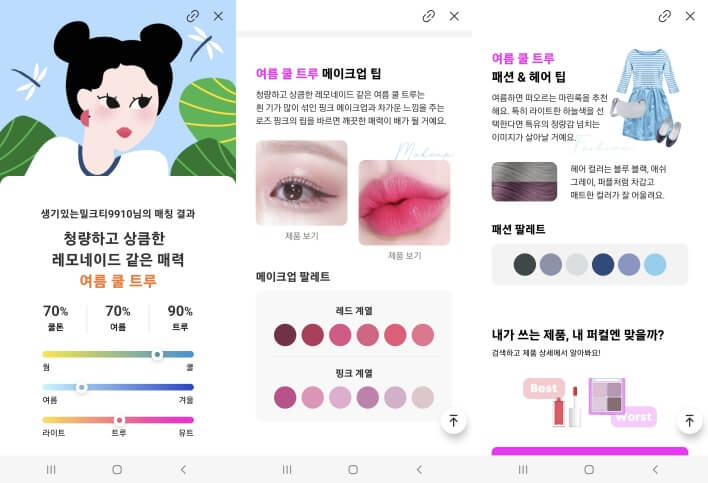 퍼스널컬러가 맞춰지면 추천 제품까지 알려주기 때문에 색조제품을 선택할 때 도움이 되더라고요.
