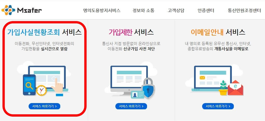 www.msafer.or.kr 에서는 명의도용 피해를 막고자 가입사실현황조회 서비스, 가입제한 서비스, 이메일안내 서비스 등을 전 국민에게 무료로 제공하고 있습니다.
