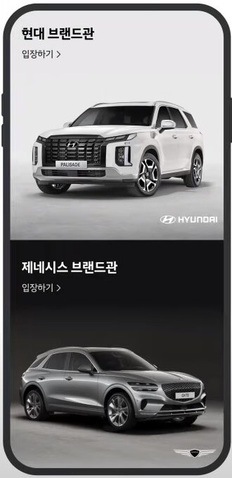 현대 브랜드관과 제네시스 브랜드관을 함께 운영하고, 신차를 구매하는 경우 브랜드 상관없이 내차 팔기(차량 연식 8년 미만, 주행거리 12만 미만)도 가능합니다.