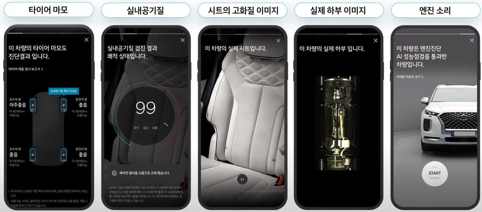 [해당 차량을 오감으로 경험해 보세요]를 클릭하면 타이어 마모도, 실내공기질, 실제 시트사진, 실제 하부 사진과 START버튼을 누르면 실제 엔진소리까지 들을 수 있습니다.