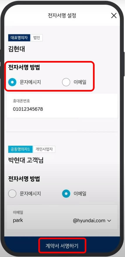 명의자 정보를 확인하고 전자서명 방법을 문자 또는 이메일 중에 선택한 후 [계약서 서명하기]를 클릭합니다.